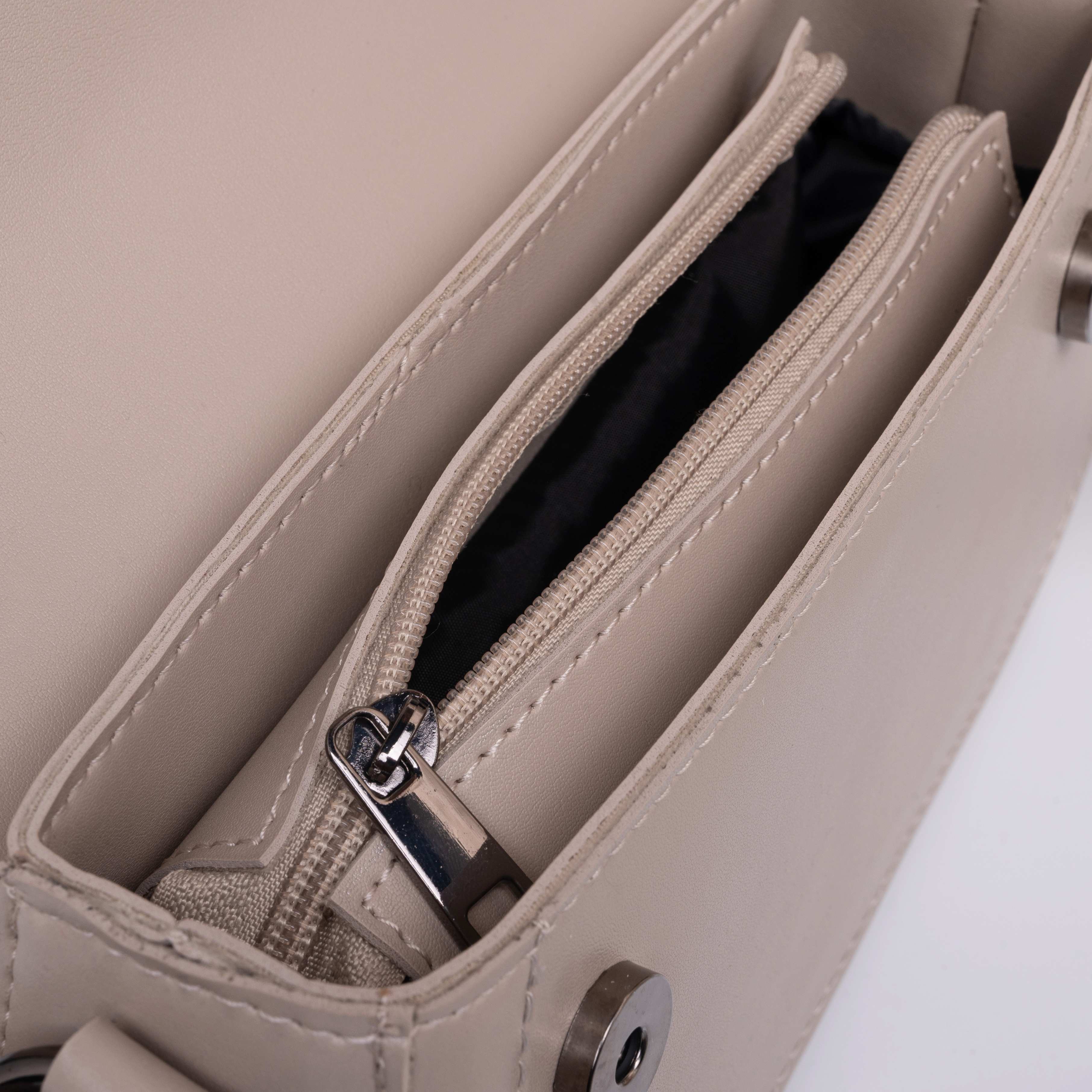 Сумка на одне загальне відділення. Не дивлячись на невеликі розміри, сумочка виявилась достатньо вмісткою. Весь виріб зачиняється на блискавку. Довгий ремінь з можливість регулювання довжини виготовлений з шкірзаміннику. На задній стінці вмонтована кишеня, яка зачиняється на блискавку.